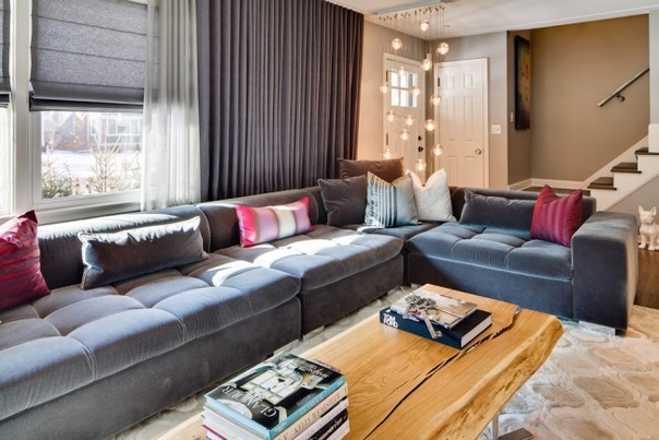 Отличный пример красивого современного дизайна с грамотным зонированием. Герой нашей подборки – серый диван – очень классно вписался в этот яркий интерьер.