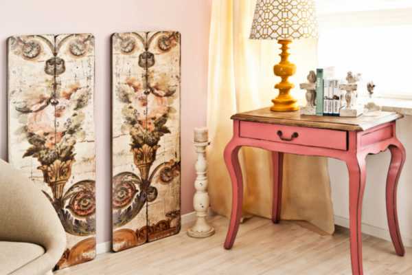 При создании элементов декора шебби-шик учитывают, что краски должны быть бледными и немного состаренными. Мебель в таком стиле должна выглядеть, как будто она выгорела от ярких солнечных лучей.