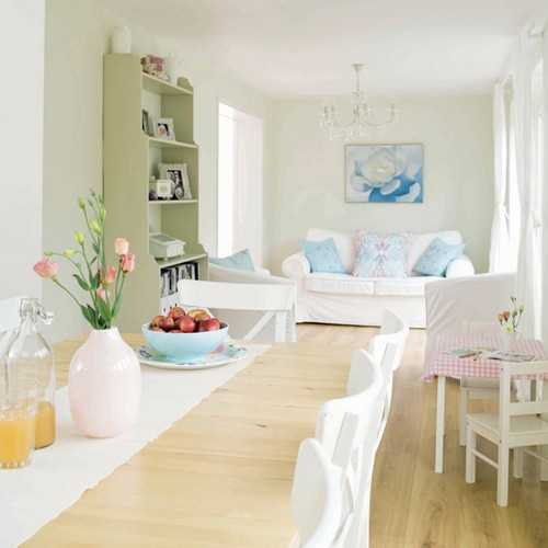 Первым принципом становится строгое использование только пастельных тонов. Рекомендуется выбирать для оформления квартиры светлые оттенки голубого, кремового, розового, сиреневого, но главным должен оставаться белый цвет. Для отделки пола следует использовать паркет с наличием потертостей или лакированные паркетные доски светлых тонов.
