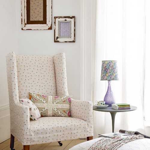 Для украшения жилого помещения используются ненавязчивые цветочные узоры и этнические мотивы. Это могут быть не только изображения роз, тонких веточек, листочков деревьев, птичек, но и картинки или фотографии ангелов, которые привычнее видеть в дизайне интерьера направления рококо. Чаще всего такой декор применяется на стенах и обивке мебели, особенно, когда речь идет про интерьер спальни.