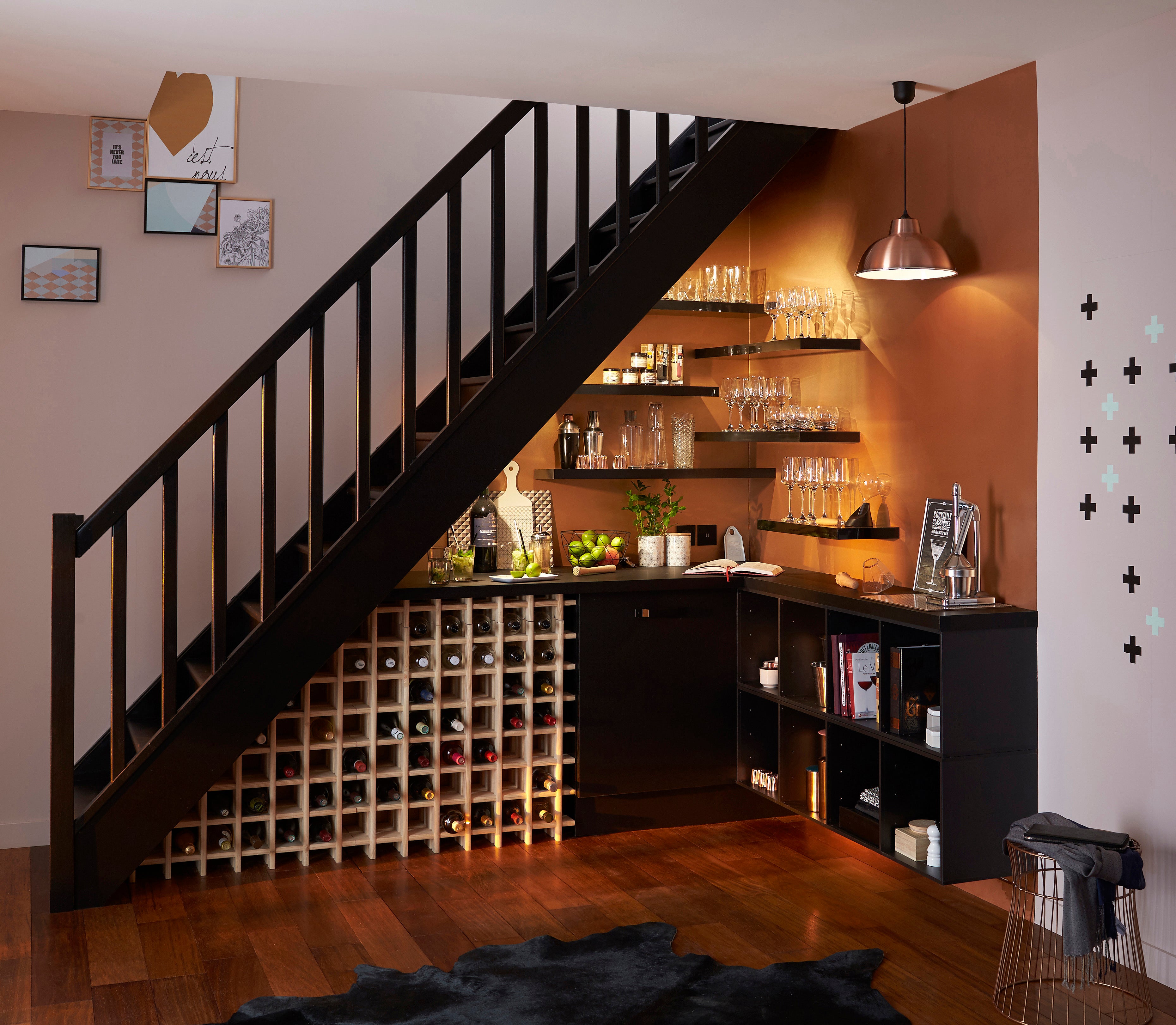 Также под лестницей можно обустроить подобие винного погреба, это очень современное и трендовое решение.