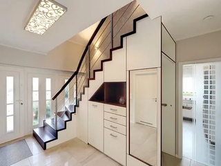 В интерьере частного дома, под лестничным пролетом, располагаются самые разнообразные системы хранения, например, такие, как кладовка, стеклянная витрина с подсветкой для коллекционных бутылок вина, небольшая библиотека, гардеробная и прочие.