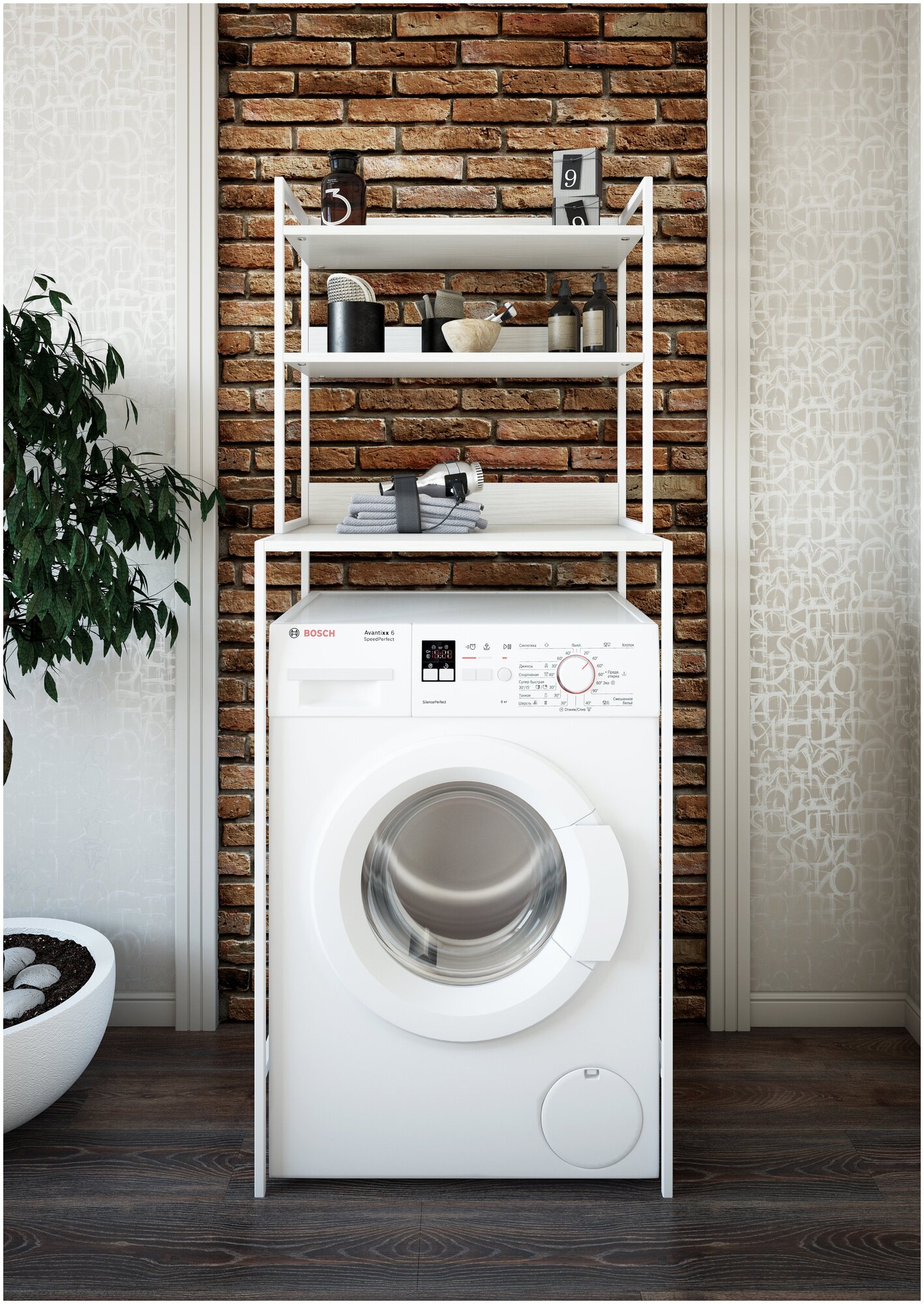 - Неизменная классика. Разместив над стиральной машиной навесную конструкцию прямоугольной формы белого цвета, состоящую из нескольких полок, можно одновременно решить два вопроса – создание дополнительного декора и хранение косметических принадлежностей. На свободных полочках открытого типа можно разместить ароматические или декоративные свечи, картинки в рамках, семейные фото, маленькие вазочки и статуэтки.