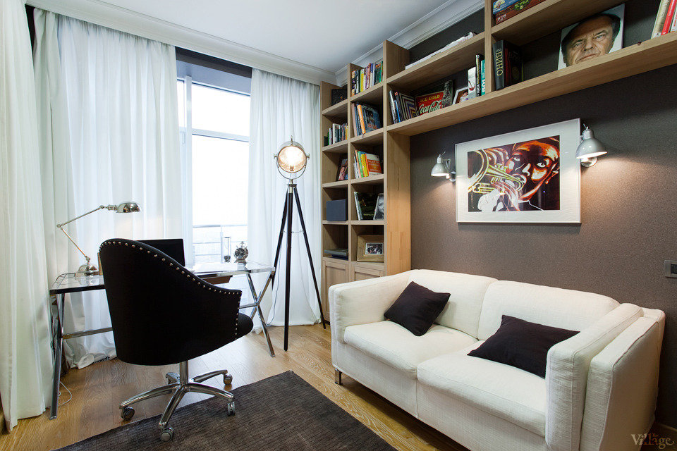 Интересно, что это решение пользуется успехом у декораторов, оформляющих гостиные в разных стилях — от классики и винтажа до современного городского стиля и минимализма. Это легко повторить, если учитывать, что стиль определяется видом стеллажей, формой дивана и цветовой палитрой интерьера вашей маленькой гостиной. А форма конструкции — практически одинакова. Смотрите примеры.