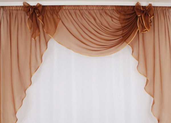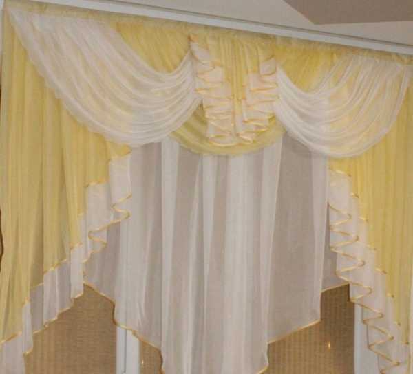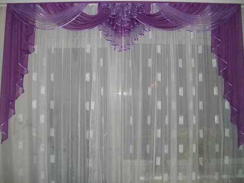 Мягкий ламбрекен. Он состоит из воздушных тканей таких как: органза, вуаль, ватин или шелк. Мягкая текстура обеспечивает изящные изгибы ткани. Модель, как правило, состоит из простых элементов: сваг(провисающая петля) и галстук(боковой элемент).
