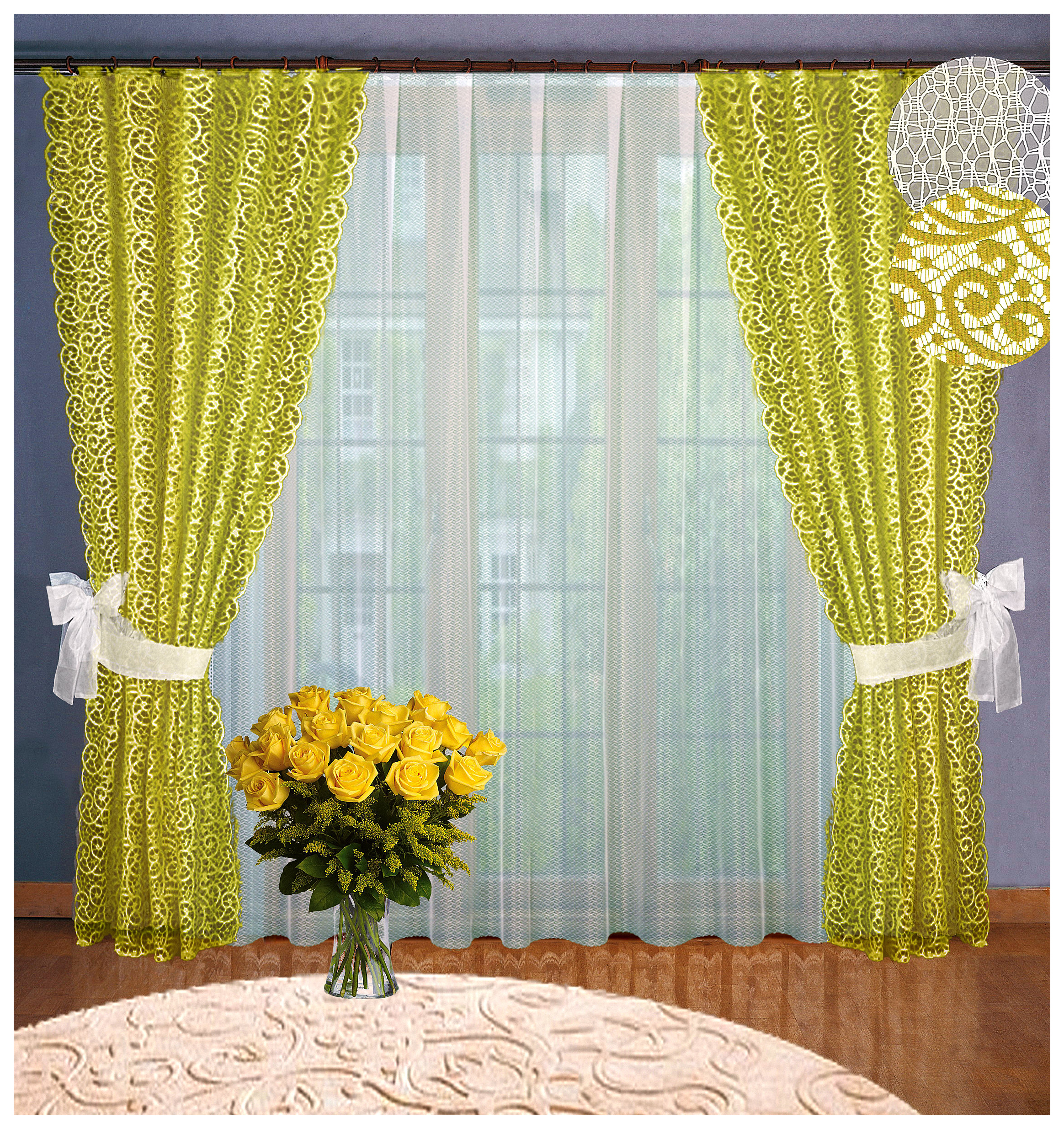 - Зелёная гамма самодостаточна. Светло-зелёные тюлевые занавески оттенят гардины более тёмного оттенка: однотонные, с рисунком или рельефной неоднородной (глянцевой и матовой) поверхностью материала. Этот цвет используется дизайнерами для всех помещений, он успокаивает, умиротворяет, а насыщенные и яркие тона зелёного выглядят нарядно и весело.