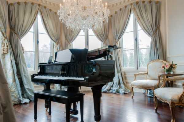 Классические французские шторы спускаются от потолка до пола многочисленными фестонными рядами. При этом они стационарны – не раздвигаются в стороны и не поднимаются вверх.
