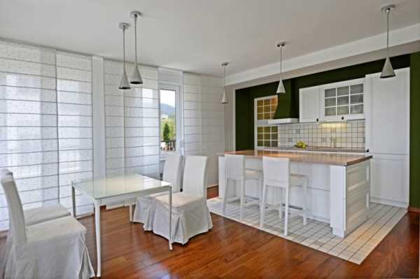 Просторную или совмещенную с гостиной кухню с высокими потолками и большими окнами японские шторы сделают еще объемнее и воздушнее.