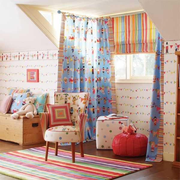 Шторы для детской комнаты можно подобрать с изображениями любимых героев мультфильмов. Изображения на однотонную ткань можно перенести своими руками.