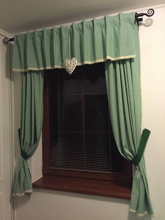 Шторы попросту вешаются под него, что делает процесс самым легким, не требующим драпировки. Допустимо использование подхватов. Одинаково великолепно смотрятся на нем и плотные портьеры, и тонкая органза, и кисея, и сетка. Подойдет для комнат в деревенском, английском, классическом стилях.