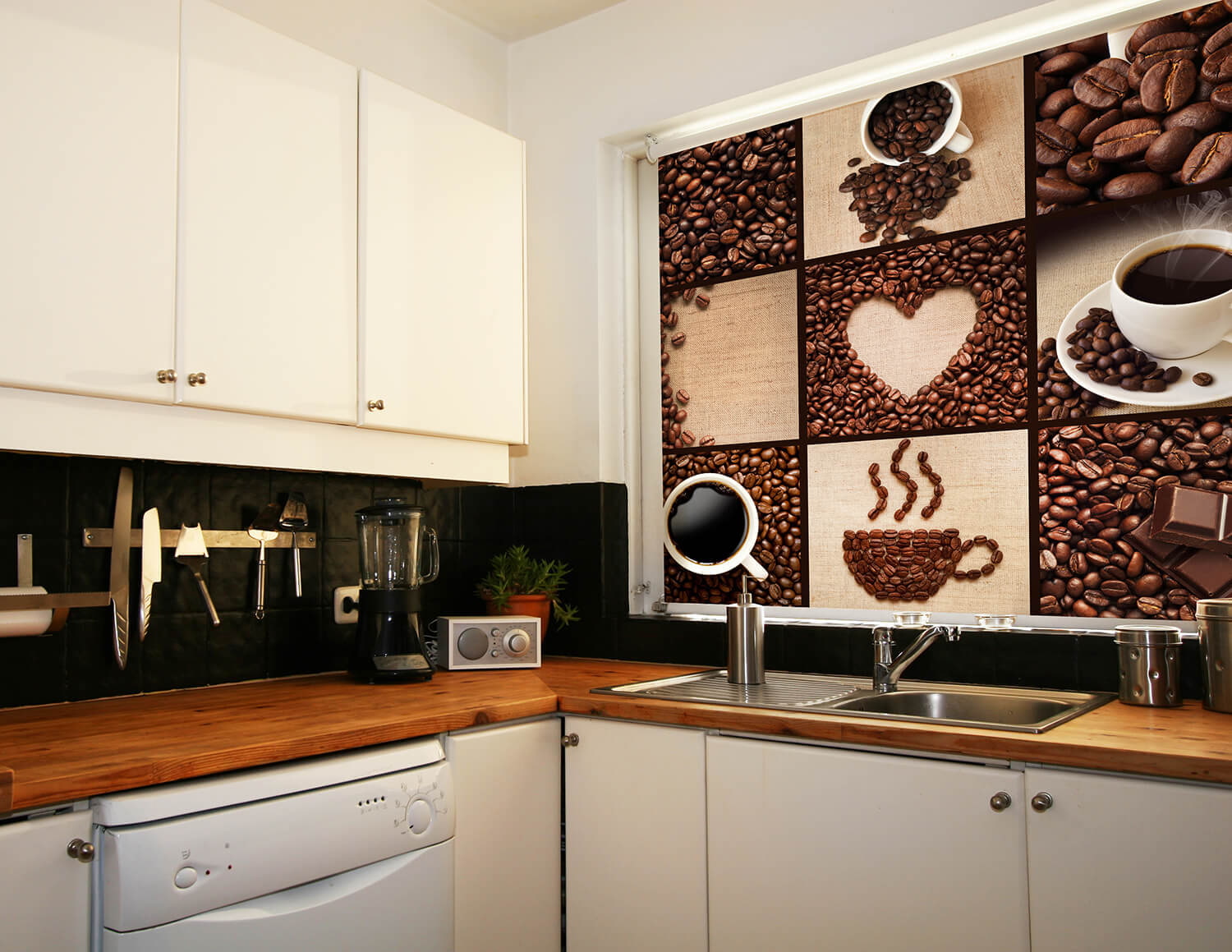 - рекомендуется учитывать оттенки стен и мебели, которые не должны сливаться с цветовой гаммой рулонного полотна. Не бойтесь экспериментировать и выбирайте сочные и вкусные оттенки. Именно на кухне уместно поместить шторы с тематическими рисунками фруктов, кофейных чашечек с дымящимся кофе, цветочным орнаментом.