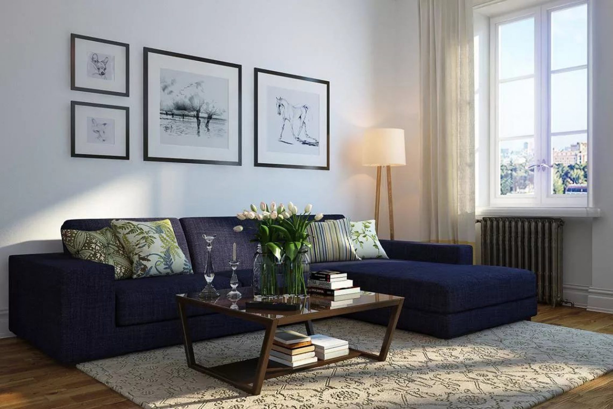 Обычно шторы подбирают под цвет дивана. Это могут быть однотонные синие полотна или украшенные принтом или рисунком. Шторы могут быть синие, но необязательно того же оттенка, что и диван.