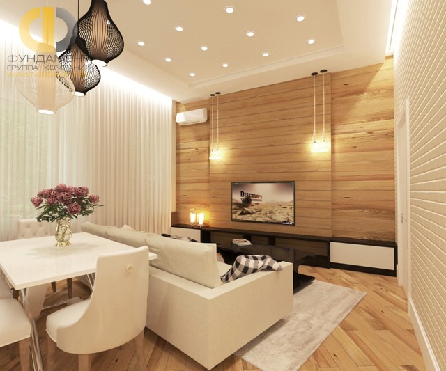 На фото: Многоуровневый свет в интерьере гостиной двухкомнатной квартиры на Новгородской