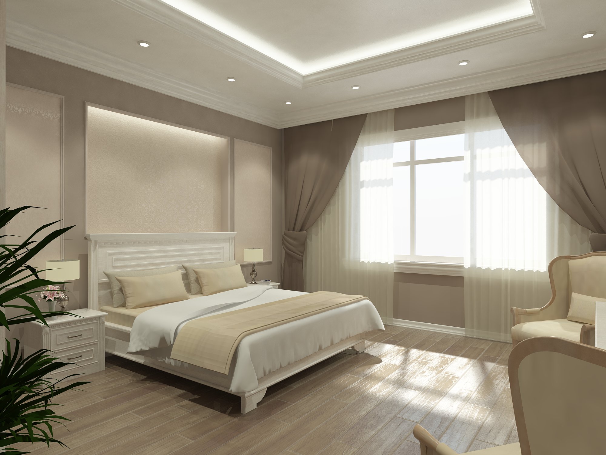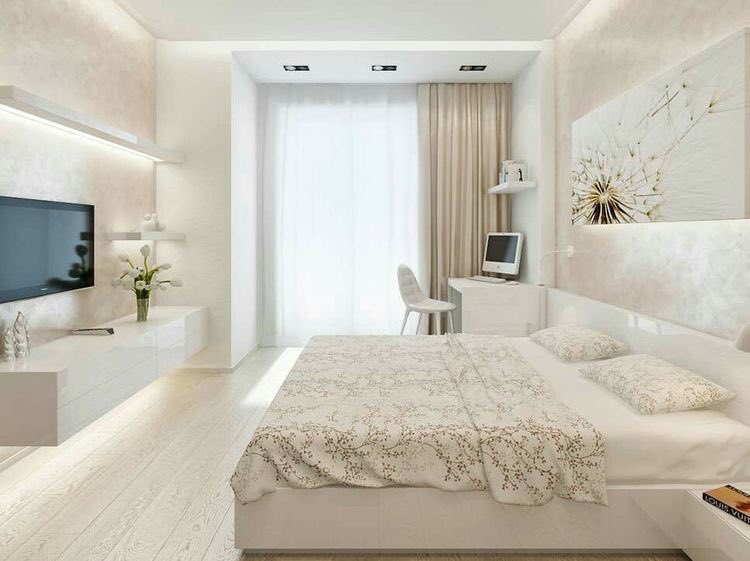 Нам нравится светлый интерьер спальни. Советуем выбрать шторы black out, чтобы во время сна свет не проникал в комнату.