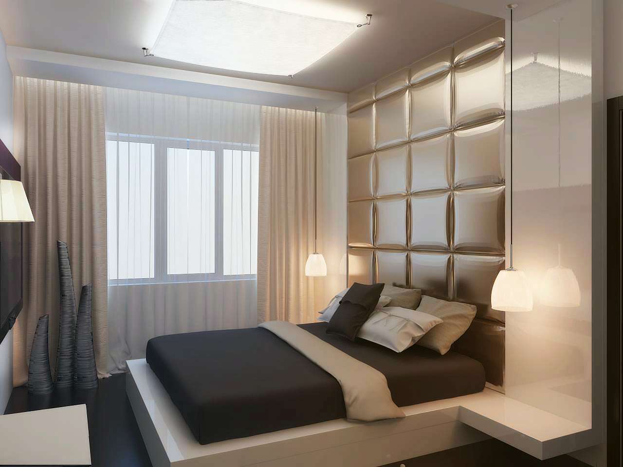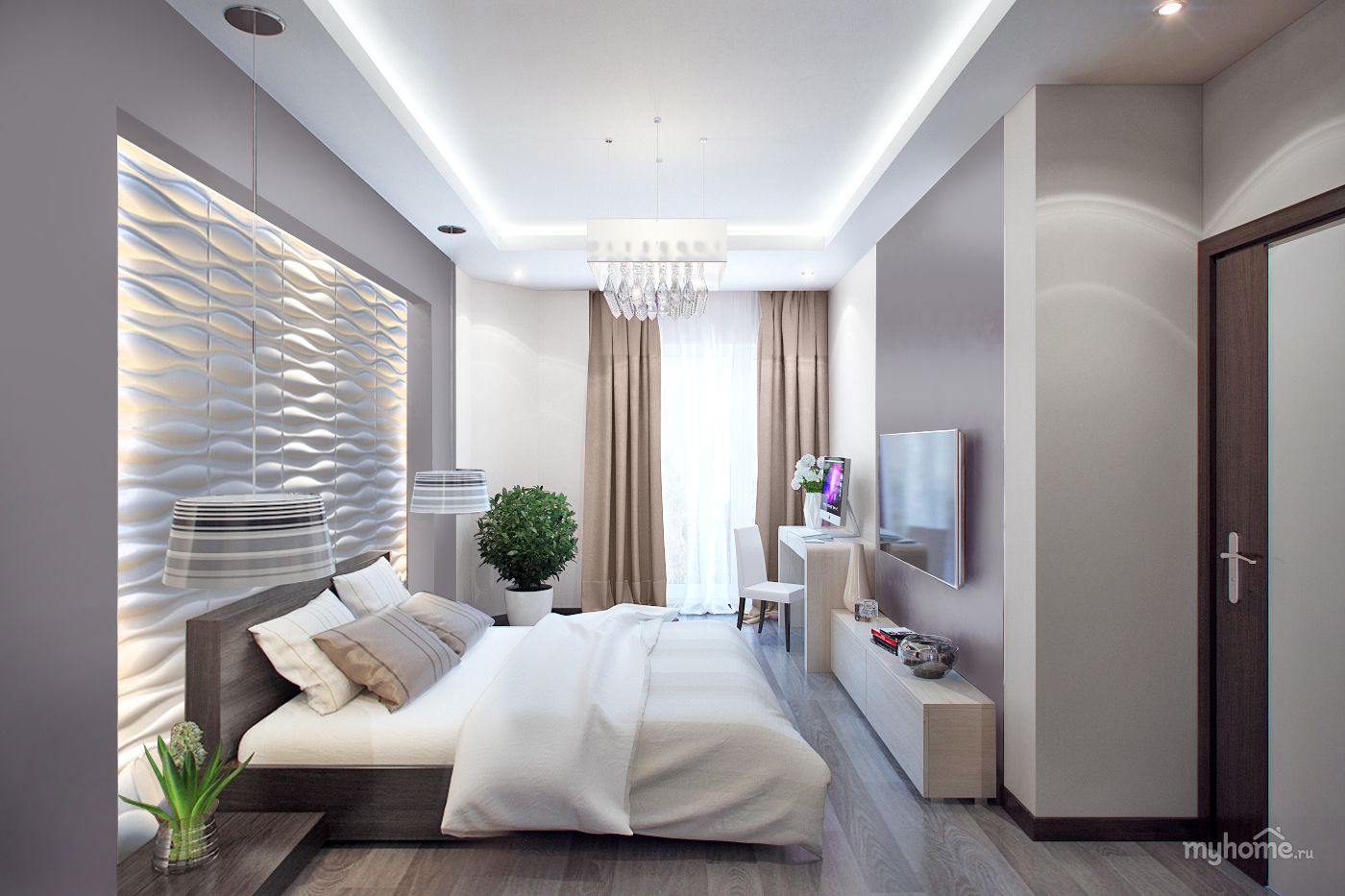 Дизайн спальни в современном стиле подразумевает простоту форм и минимум аксессуаров. В качестве украшения может выступить акцентная стена. В нашем случае — это оригинальное панно в изголовье кровати.