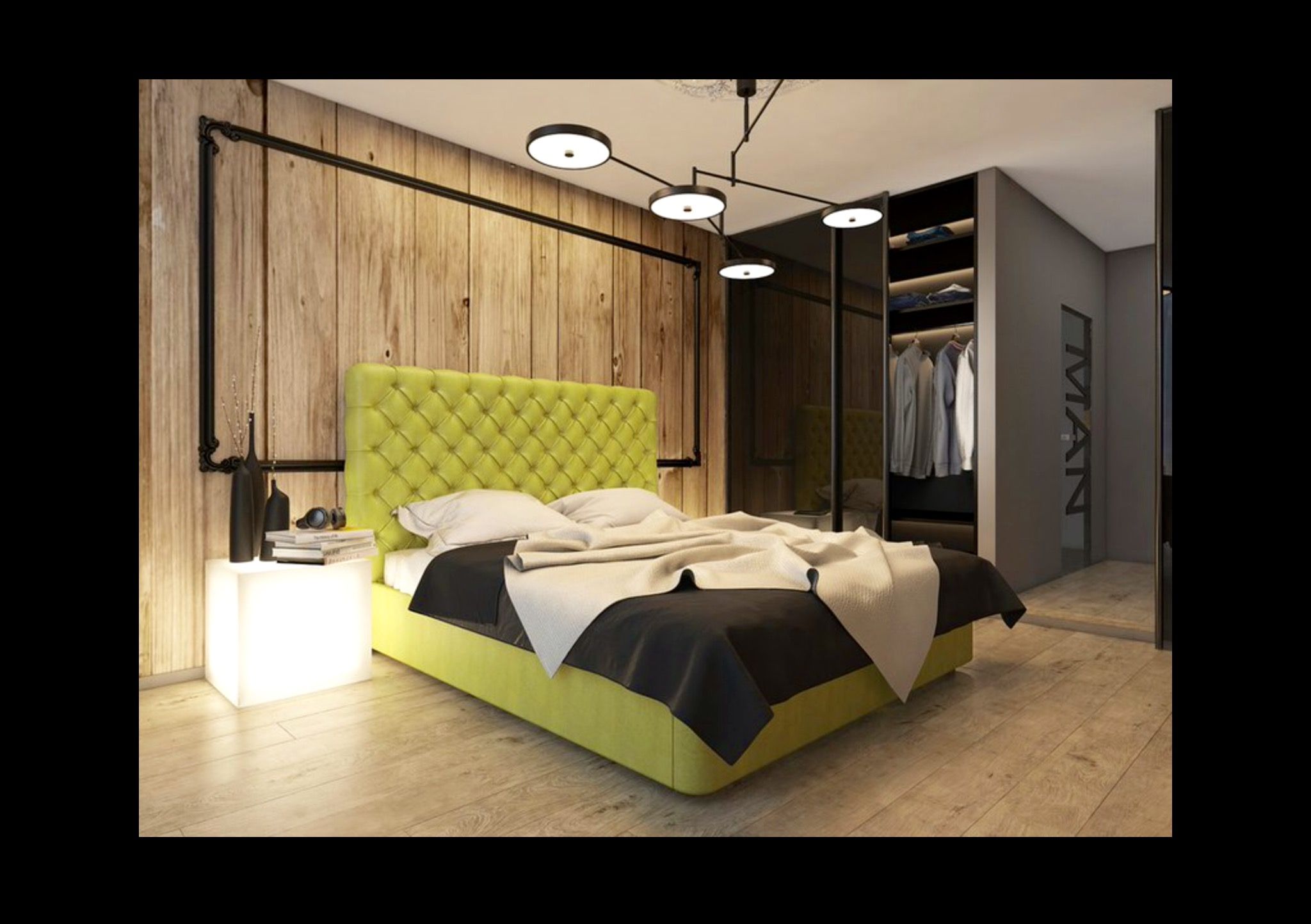 Игра геометрических линий в современном интерьере – это всегда интересный результат. Слегка смягчить интерьер нам удалось с помощью уютного текстиля и мягкого изголовья кровати.