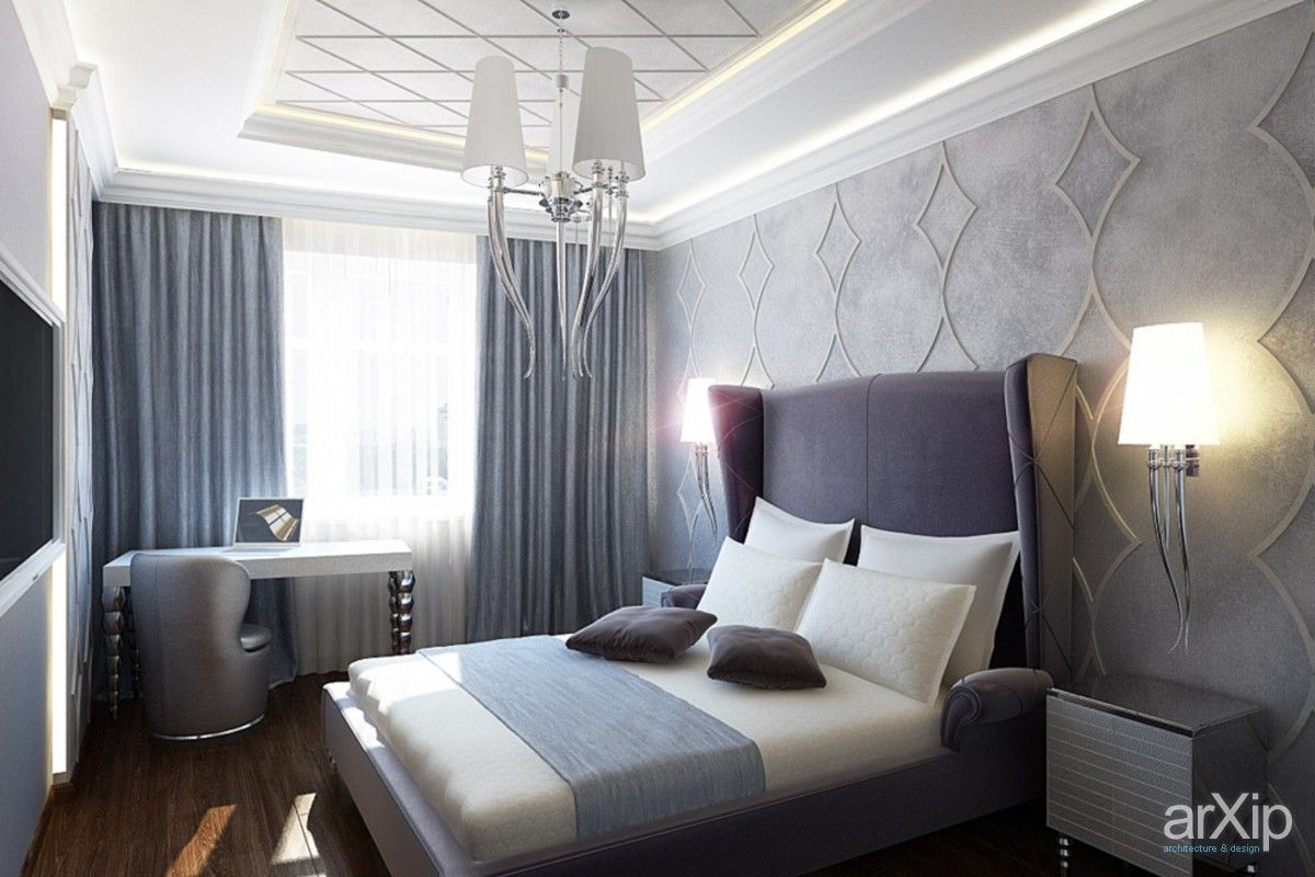 Смотрите, какие необычные светильники и прикроватный столик! А как вам небольшая рабочая зона слева?