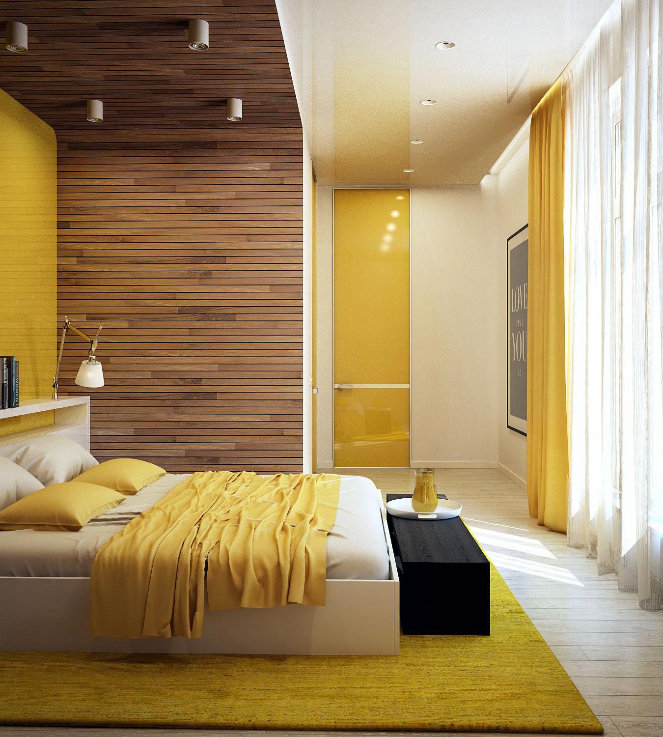 «Наступает ночь, просыпается мафия». 🙂 Акцентный цвет — хорошее решение для любого помещения, но обратите внимание, как уместен здесь жёлтый цвет! Благодаря ему спальня не выглядит мрачной.