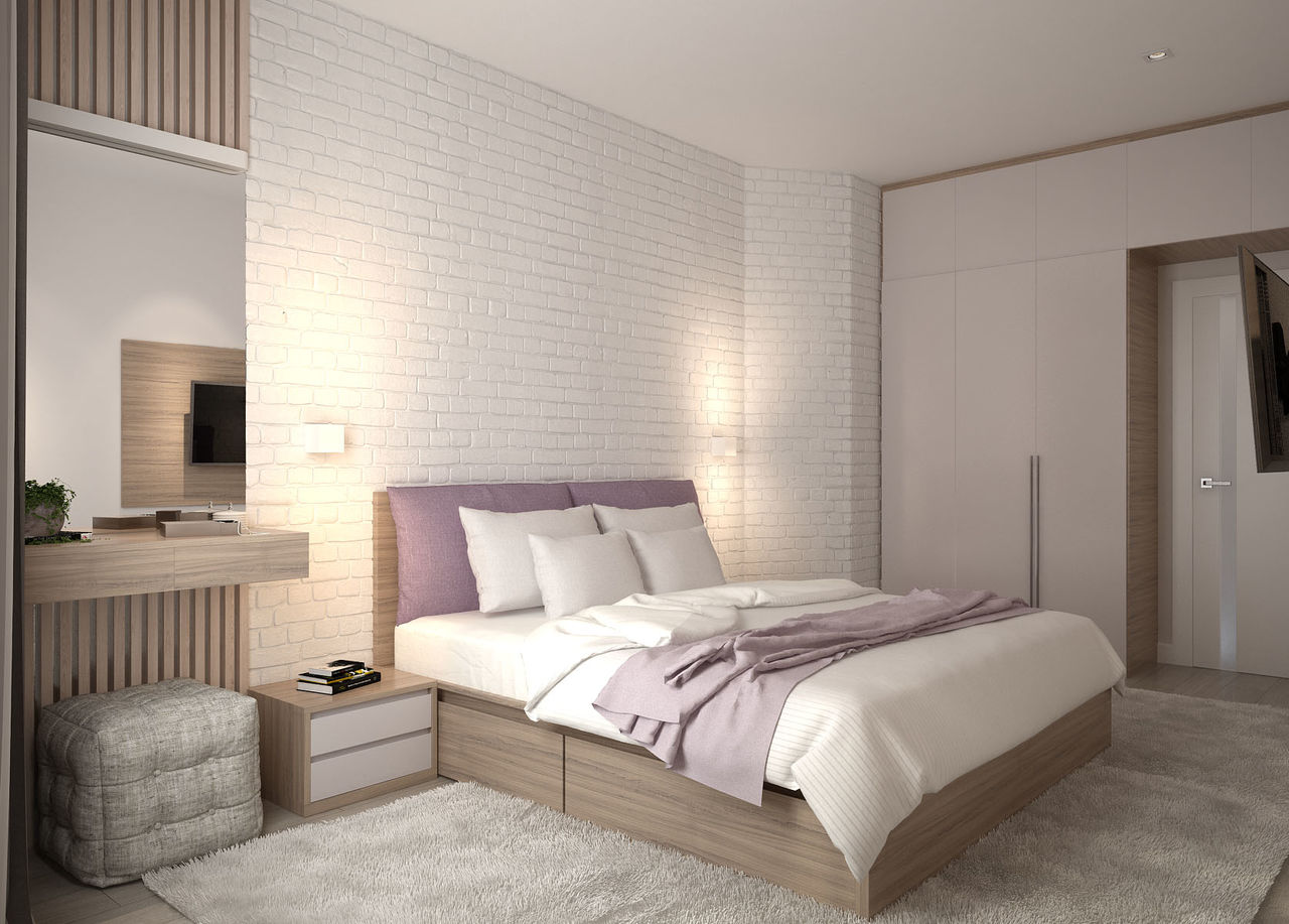 Первое, на что обращаешь внимание в этом интересном проекте — оригинальное оформление стены в изголовье кровати. Также заслуживает отдельного упоминания рабочая зона — она занимает минимум места, но при этом крайне удобна. Вообще, в этом интерьере есть на что посмотреть и что рассмотреть. 🙂