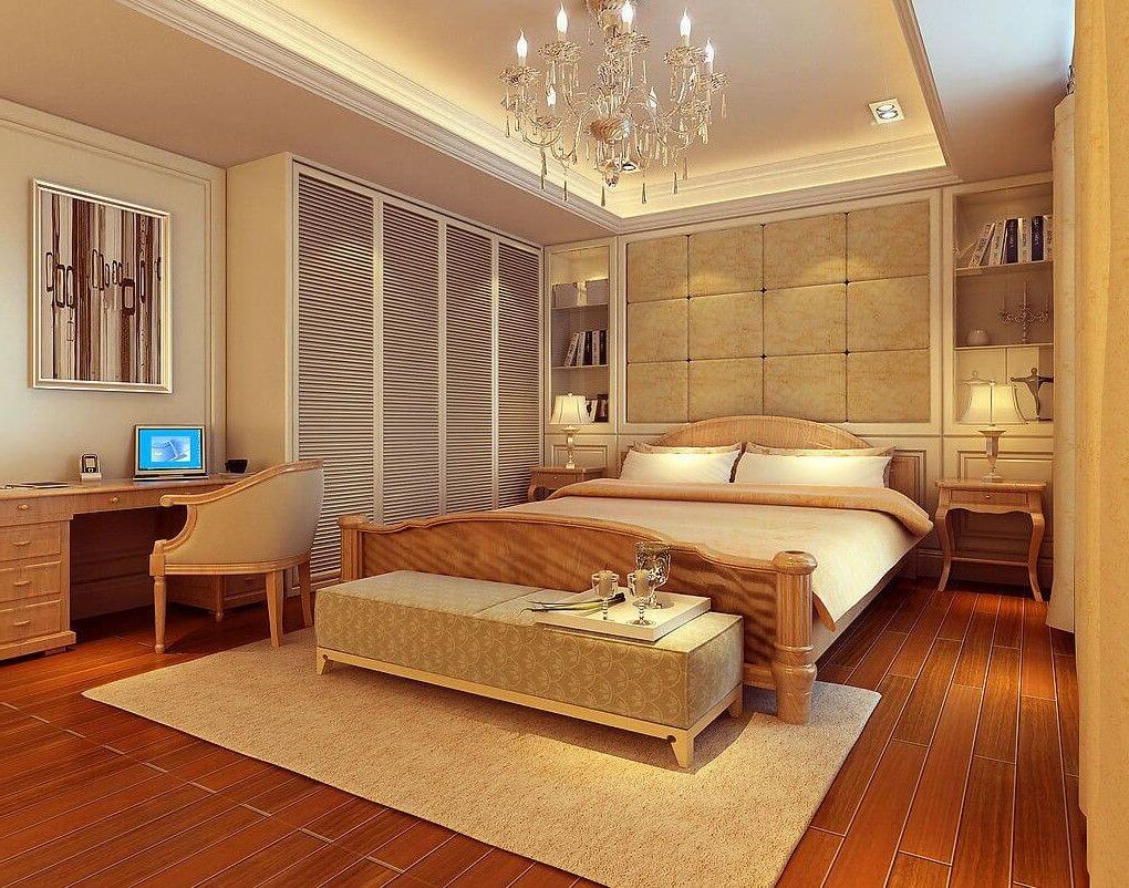Ещё один вариант тёмно-синей спальни, но уже в сочетании с бежевым и золотым тонами, из-за чего сразу поменялось и её настроение. Золотые элементы в декоре, если с ними не переборщить, добавляют изысканность и благородство. Благодаря этому свойству, их часто используют в классических интерьерах.