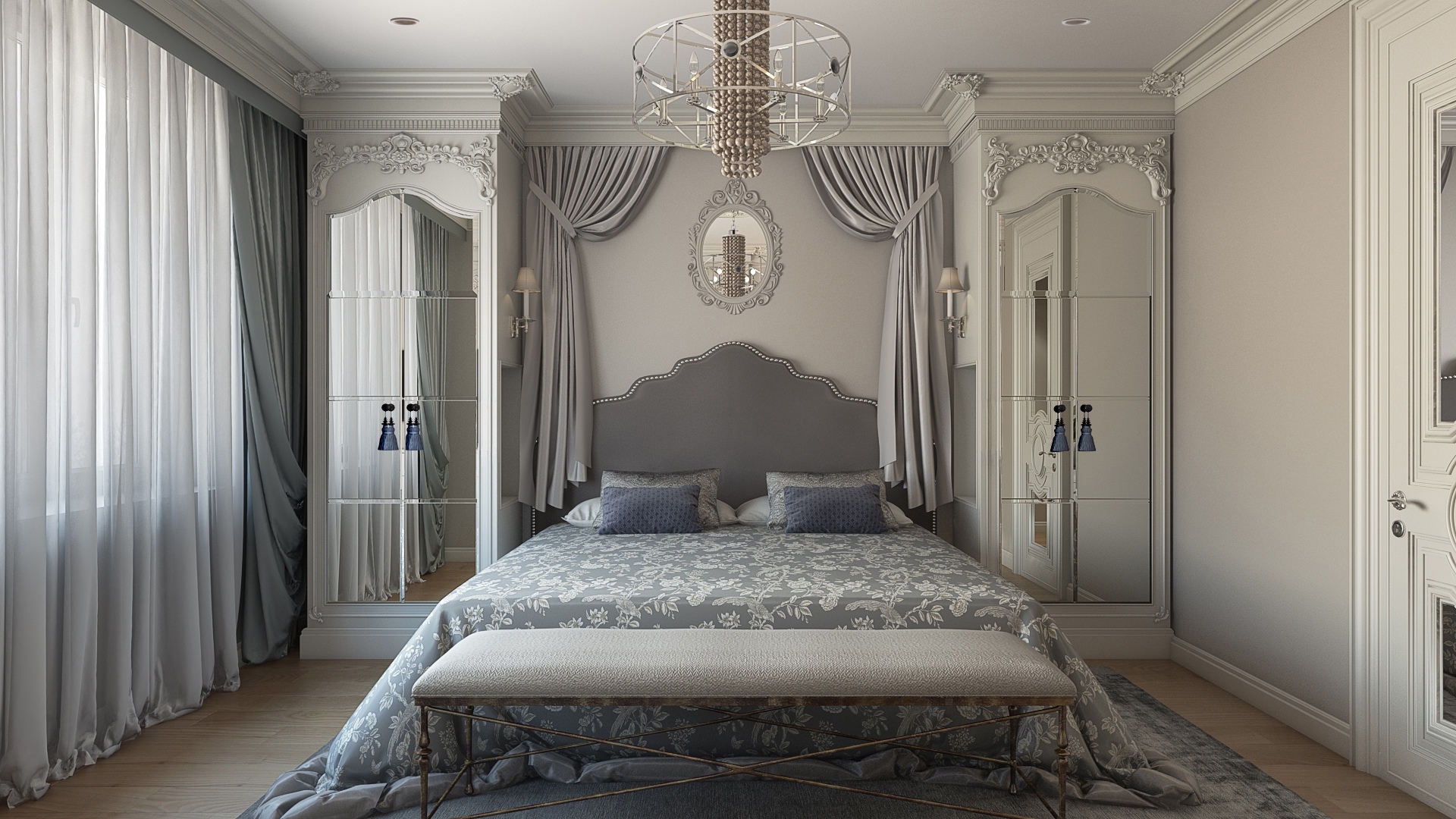 Хоть эта спальня и кажется на первый взгляд несколько минималистичной, тем не менее, в ней присутствуют и элементы классического стиля. Симметрично расположенные тумбочки с одинаковыми лампами, фасады шкафа, банкетка в ногах кровати – всё это от классики.
