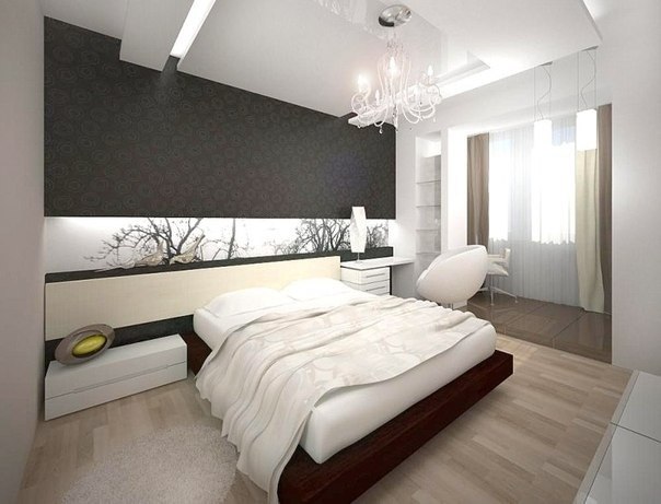 Часто спальни стараются сделать как можно светлее и избегают темных оттенков. Но посмотрите, как здорово и стильно на фоне остального светлого интерьера смотрится эта дизайнерская графитовая стена. Настоящий арт-объект!