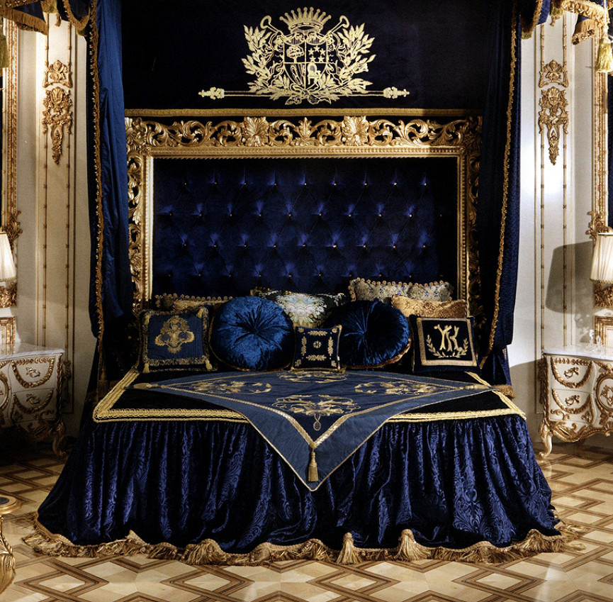 Поскольку кровать является центральным элементом дизайна, декорирована она должна быть шикарно. Внимание обязано привлекать изголовье. Оно может быть массивным, из резного дерева с инкрустацией. Балдахин над кроватью должен напоминать шатер и быть изготовлен из дорогих тяжелых тканей, например, бархата или шелка. В поистине богатых интерьерах столбики кровати украшаются резьбой, вставками из ценных пород камня или даже бивней слонов.