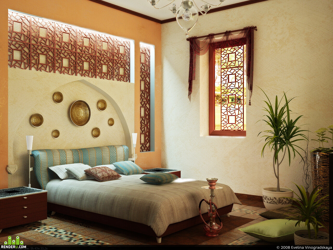 Внимание обязано привлекать изголовье. Оно может быть массивным, из резного дерева с инкрустацией. Балдахин над кроватью должен напоминать шатер и быть изготовлен из дорогих тяжелых тканей, например, бархата или шелка. В поистине богатых интерьерах столбики кровати украшаются резьбой, вставками из ценных пород камня или даже бивней слонов.В комнате должно быть много подушек разных форм и размеров, которые могут присутствовать не только на кровати, но и играть роль мест для сидения на полу. Покрывала и подушки всегда украшаются искусной вышивкой, драгоценными камнями (в современном варианте, разумеется, их заменяют стразы) и кистями.