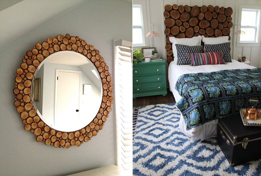 Настенные панно, рамы для картин и зеркал, подставки под горячее блюда, шторы из мелких деревянных кругляшей – возможности декорирования с помощью этого натурального материала ограничиваются только фантазией дизайнера. Один или несколько деревянных дисков помещенных в раму уже могут претендовать на статус самостоятельного арт-объекта, если доверить оформление интерьера умелым рукам.