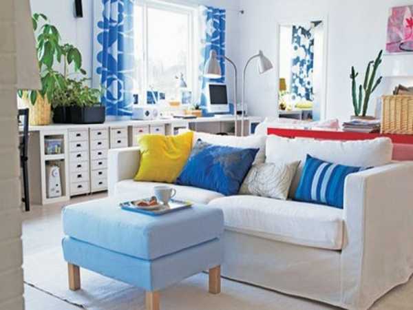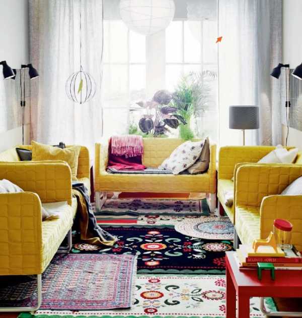 IKEA выпускает белые, светлые, яркие, темные и черные диваны и кресла. Для маленькой гостиной стоит выбирать предметы на колесиках или ножках, которые кажутся боле легкими.
