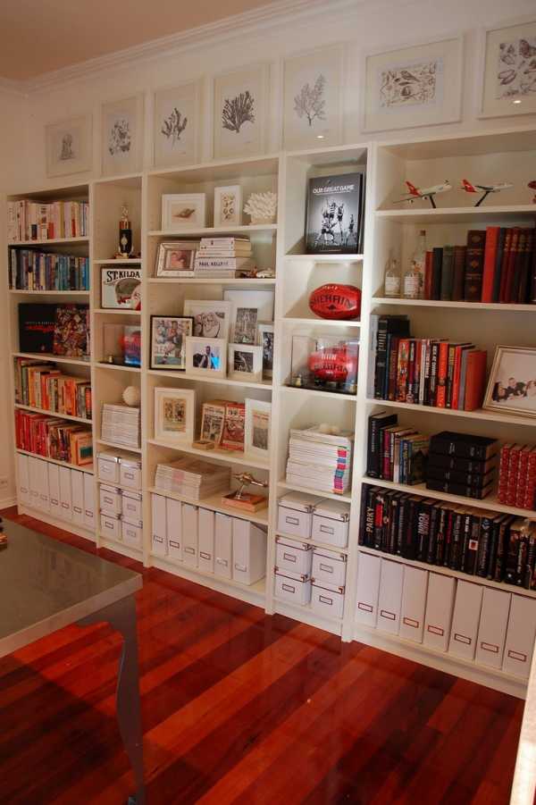 Стеллажи Билли простой формы, однотонные и служат прекрасным фоном для размещения множества интересных и нужных предметов в гостиной.