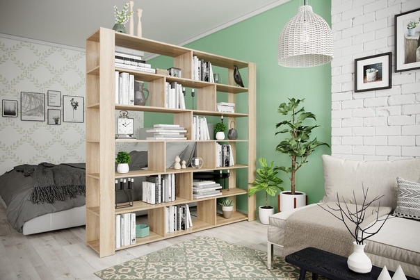Очень популярно стало использовать стеллаж в качестве перегородки, которая помогает разделить гостиную на несколько функциональных зон.