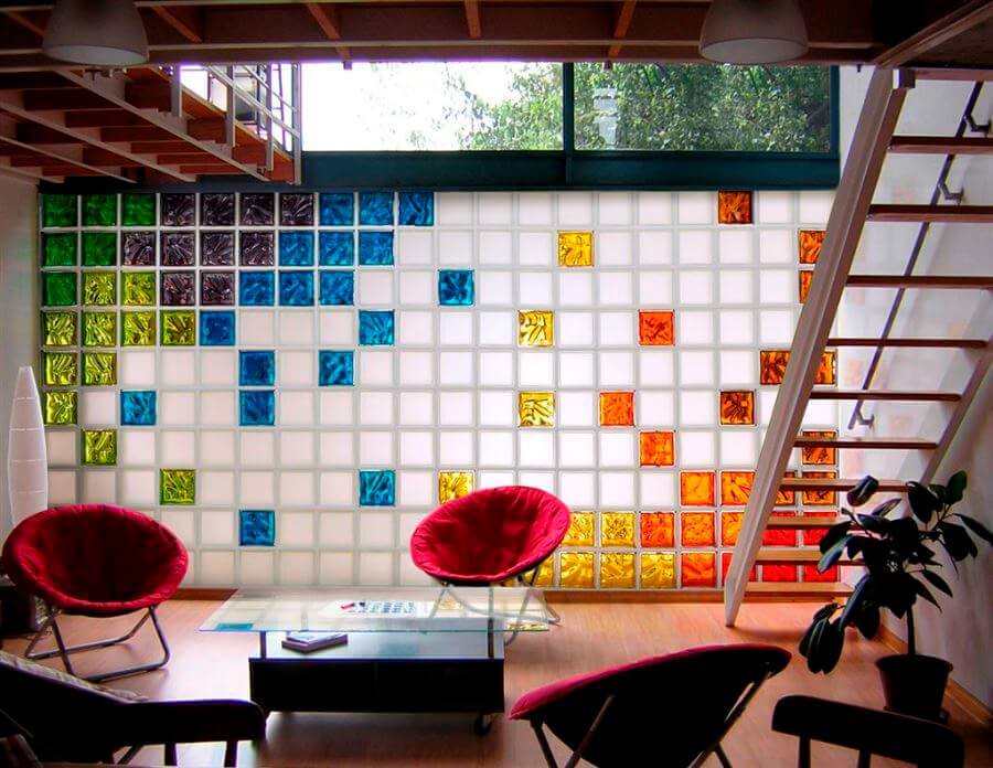 Прекрасно смотрятся фасады из них для барной стойки. Из них можно соорудить стол или журнальный столик, тумбочку, шкаф. При этом блоки используются и в качестве каркаса или фасада, и для формирования столешницы. Декорирующие элементы. Для использования стеклоблоков в интерьере помещения практически не существует границ. Их применение в качестве декорирующих элементов обеспечивает исполнение любых фантазий. Изделия с внутренними декоративными вставками позволяет оформить на стене картину с объемным эффектом. Такая картина легко очищается от грязи и сохраняет краски длительное время. С помощью стеклоблоков интерьер можно оформлять в современном стиле (лофт, хайтек, модерн), арт-стиле или барокко. Прекрасно смотрятся витражи в стиле ар-нуво с классическими или восточными сюжетами. Из стеклянных кирпичей выкладываются арки, ниши, колонны. Встроенные в стену отдельные элементы могут исполнять роль точечных светильников.