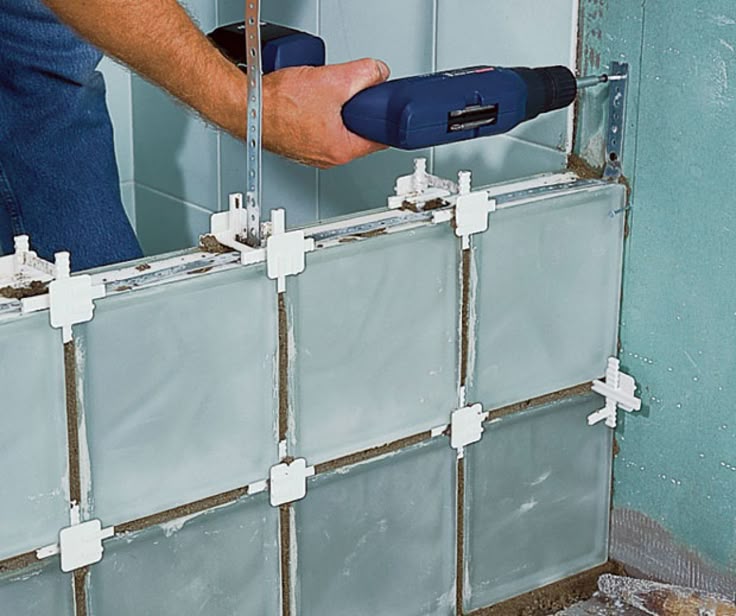 Системы установки стеклянных блоков бесконечно проще, чем в «старые плохие времена». Душевая стена Protect-All из стеклянных блоков поднимается, как блоки Lego. В этой системе один ряд просто размещается на ряду под ним.