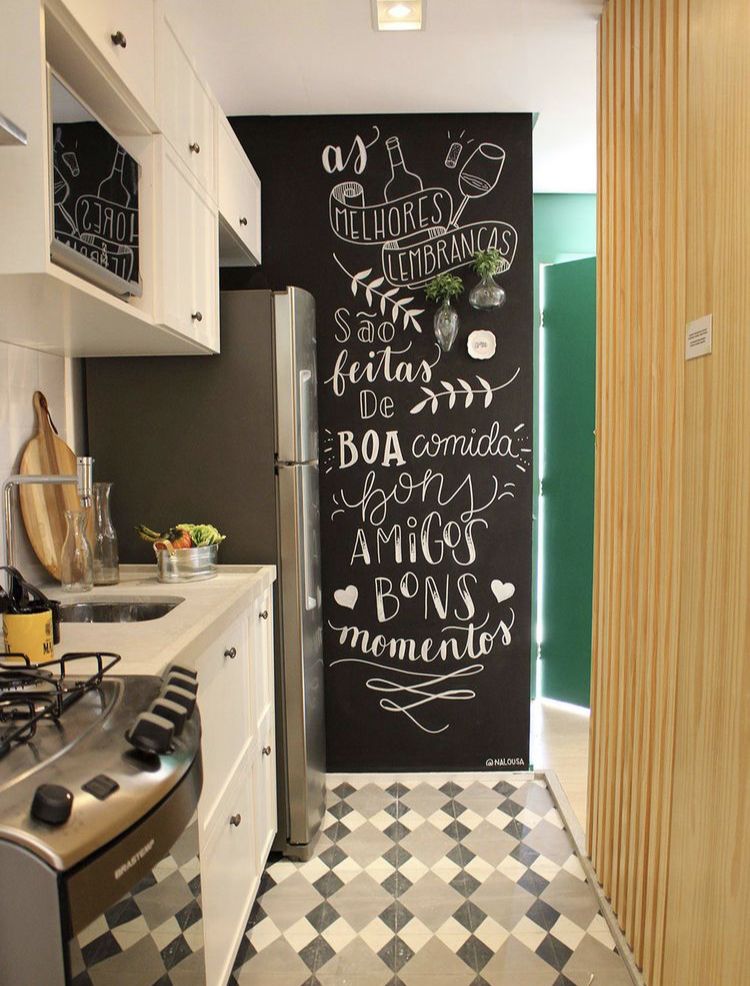Если место для приготовления пищи находится на острове с видом на стену, краска для меловой доски — отличный способ придать этой стене индивидуальность. Вы можете дополнить стену аксессуарами на нанесите магнитную краску под краску для классной доски , чтобы вы могли использовать ее как для мела, так и для магнитов. Двери в стене? Нет проблем, закрасьте их прямо поверх них, оставив открытой только дверную ручку. Эта стена — такое шикарное дополнение к квартире, и посмотрите на остальную часть этого небольшого пространства.