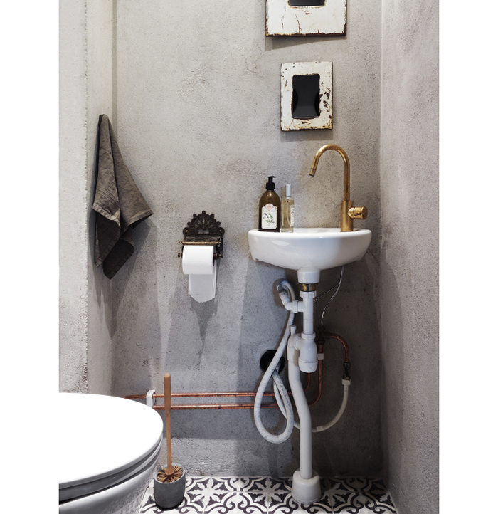 Смелый и бюджетный вариант — вовсе отказаться от краски и оставить стены бетонными, покрыв их прозрачным матовым лаком. Как и для любой небрежной отделки, здесь потребуется совершенство всех остальных деталей — сантехники, труб, аксессуаров, плитки на полу. На фото ниже тон помещению задает контраст золота и бетона.