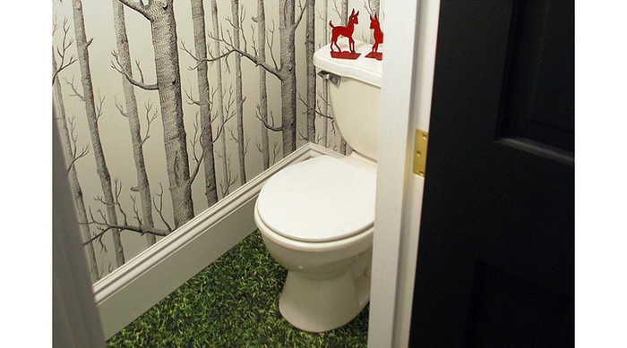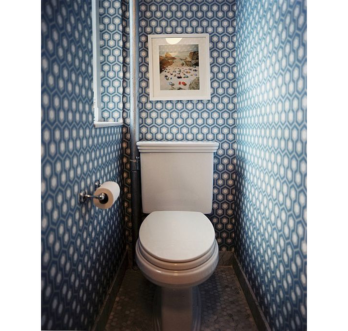 Покрытые орнаментом стены смотрятся немного пестро, но не скучно. В примере снова использованы обои, но можно добиться схожего эффекта при помощи самодельных или покупных трафаретов. На фото стены не давят за счет того, что орнамент прерывается картиной, а в стене есть окно. В российских домах окон в уборной не встретишь, так что можно просто оставить одну стену однотонной или повесить постер побольше.