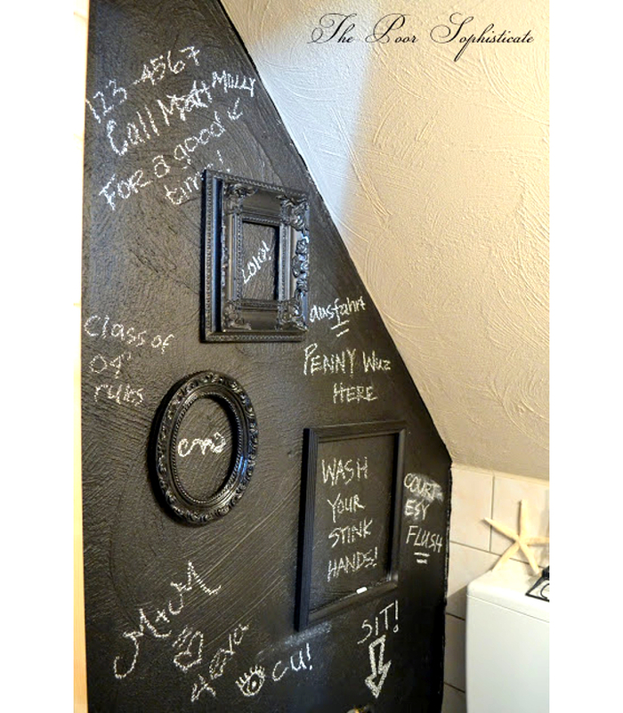 Черной (или цветной) грифельной краской можно покрыть заднюю, боковую или любую другую стену помещения, а также часть стены. Матовый черный цвет почти всегда выглядит стильно, к тому же на стенах можно будет рисовать и оставлять записки. Удобно, если в доме есть дети.