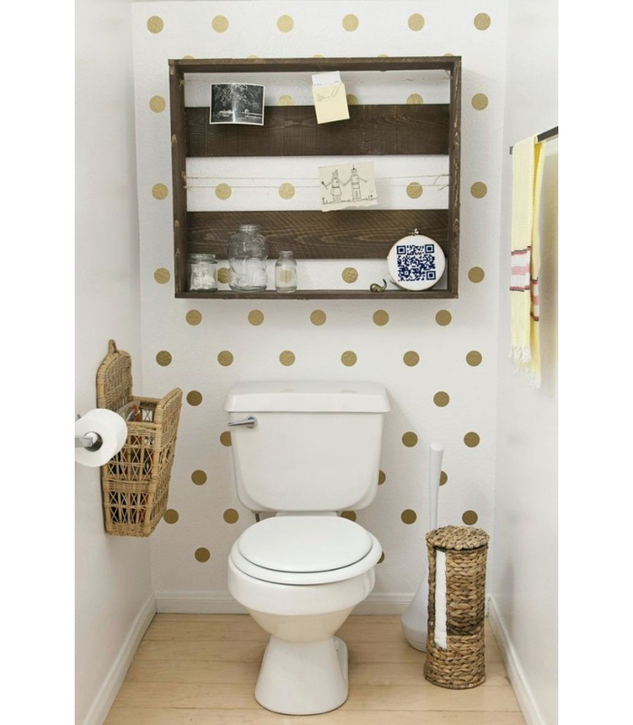 Трудно представить туалет без каких-либо аксессуаров. Естественно, их необходимо где-то разместить. Варианты с размещением небольших шкафчиков на задней стенке особо популярны. Приведем примеры с реальными фото.