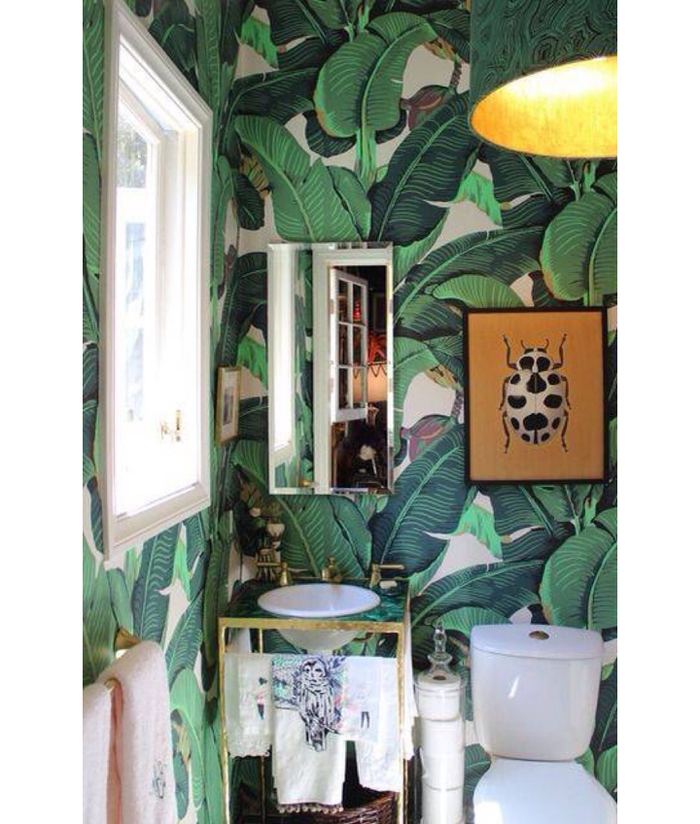 Правило, гласящее, что яркому и крупному принту не место в маленьком помещении, не универсально, его можно и нужно нарушать. В примере на фото использованы обои, но при желании и художественном таланте стены можно раскрасить и самому. Получится как минимум нескучно: никто не ожидает ярких стен в маленьком помещении, тем более, если это туалет. К тому же экспериментировать в максимально скрытом от глаз уголке дома удобно, если вы решили оформить квартиру в едином стиле, но боитесь устать от однообразия.