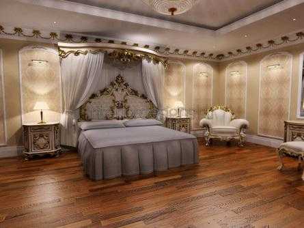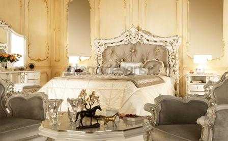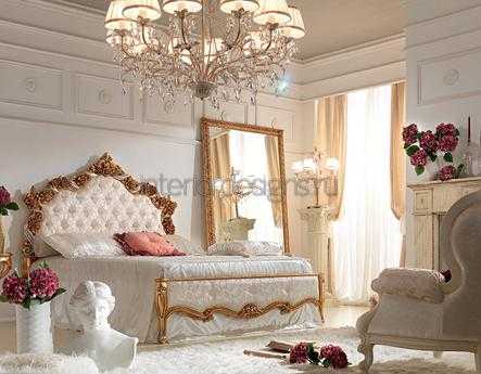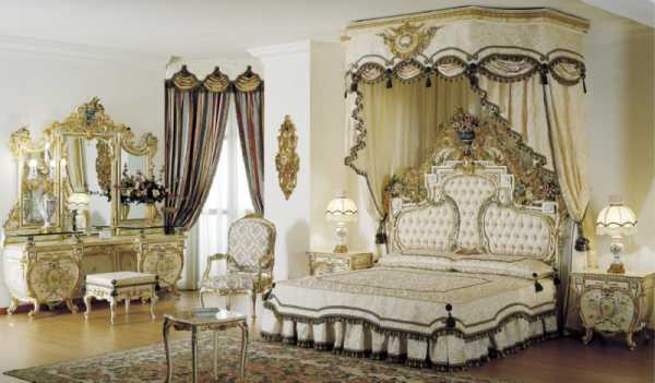 Кровать для спальни подбирают дорогую с золотистыми элементами, ее практически во всех случаях дополняет балдахин. Прикроватную тумбу вместе со столиком меняют на тумбочку с зеркалом, выполненное изысканными линиями с огромной зеркальной поверхностью с элегантными орнаментами.