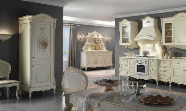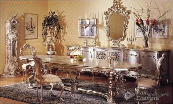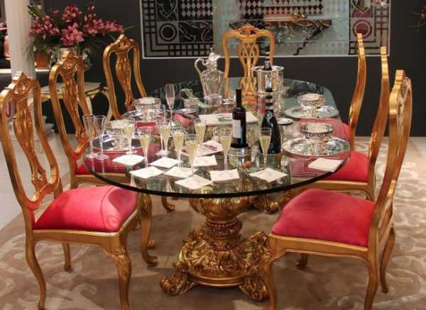Мебель для кухни покрывается лаком или перламутром, инкрустируется слоновой костью или позолотой, а также украшается резьбой по дереву. Как правило, используется золоченая фурнитура. Приветствуются серванты со стеклянными дверцами. Купите массивный большой деревянный стол круглой формы, который станет главным акцентом на кухне. Стулья должны быть с дорогой обивкой и на резных изогнутых ножках.