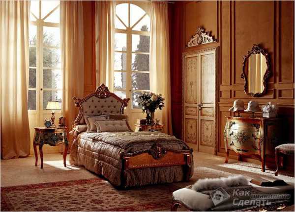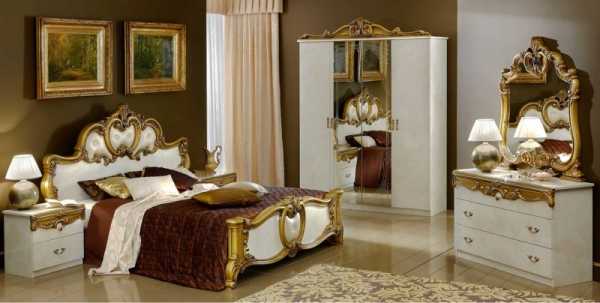 В трюмо обычно хранят ценные вещи и украшения. Мебель для спальни барокко дополняет интерьер своим богатым видом. Оконные проемы украшают легкими шторами в сочетании с воздушными тюлями.