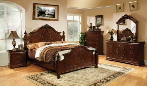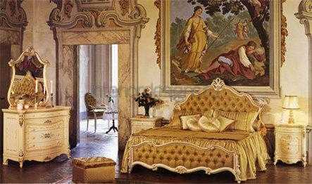 Кровать. В интерьерах дворцов кровати всегда отводилось особенно важное место. Но и сегодня кровати отводится центральное место при оформлении спальных комнат. Дорогие, массивные, стилизованные под старину кровати изготавливаются, как правило, из красного дерева или прочих ценных древесных пород. Их украшением считается не только изголовье, но и ножки, декоративно выточенные, к примеру, в форме виноградных гроздьев. Возле кровати уместно размещение прикроватных тумбочек, массивного трюмо, на которых размещаются дамские шкатулочки и подсвечники (настольные лампы) из бронзы.