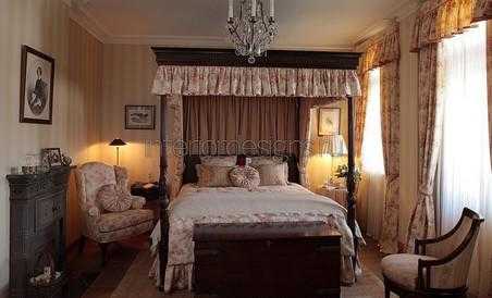 Камин. Для английской спальни характерно наличие камина. В частном доме, конечно же, разумно соорудить настоящий камин. Ели такой возможности нет, можно установить электрический аналог, декорированный под натуральные материалы (камень либо плитку).