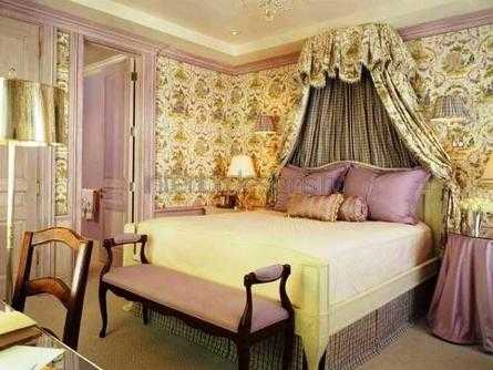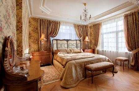 Цветовая гамма и отделка. Для спальни аристократов подходят только натуральные оттенки: коричневый, песочный, изумрудный, рыжий, красный. В отделке все больших поверхностей прослеживается четкая симметрия, аккуратность линий и форм. Для покрытия пола рекомендуется использовать натуральное дерево либо же его качественные «заменители» (например, паркетная доска). Потолок может быть отделан разными способами – декоративной доской, штукатуркой или краской.