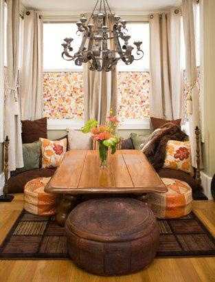 С помощью текстиля (шторы, подушки, покрывала, пледы) можно быстро и относительно недорого придать интерьеру атмосферу Марокко.