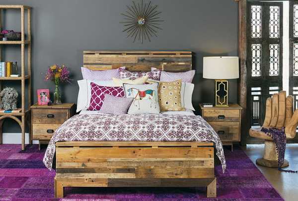 Стильный и изящный вид спальне, оформленной в североафриканском стиле, можно придать за счет оттенков фиолетовой гаммы. Эту палитру можно разбавить золотистым: с его помощью расставляют металлические акценты, создают королевские комбинации.