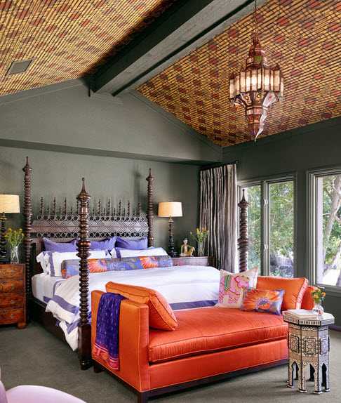 В декоре должны преобладать сложные узоры: сделайте так, чтобы спальня напоминала роскошные апартаменты с восточным характером.
