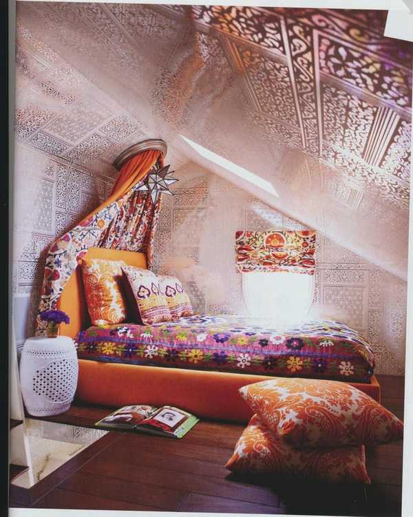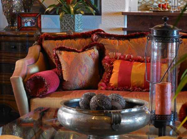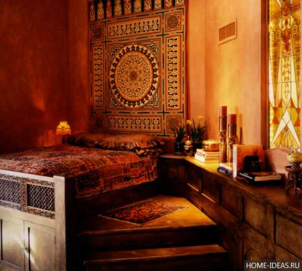 Восточные интерьеры декорируются в яркой гамме. Пестрые цветочные рисунки должны присутствовать на подушках, пастельном белье, ковровых покрытиях.